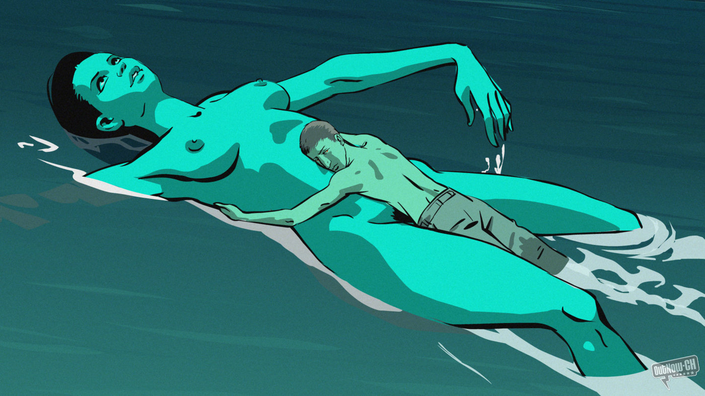 Ed è ancora l’acqua di un mare denso come il petrolio, quella nella quale il giovane Folman si bagna assieme a due compagni, la notte di Sabra e Chatila, mentre il cielo viene rischiarato dai razzi dell’esercito israeliano, quasi a voler facilitare il massacro in atto nel campo profughi palestinese.