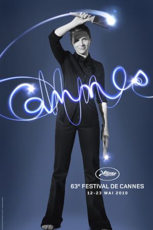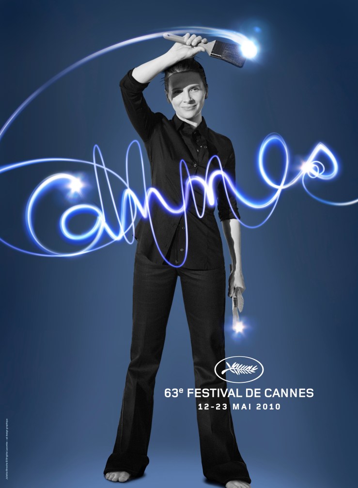 Ecco il poster del 63° Festavla di Cannes: Juliette Binoche, fotografata da Brigitte Lacombe, mentre scrive con un pennello luminoso la parola Cannes.