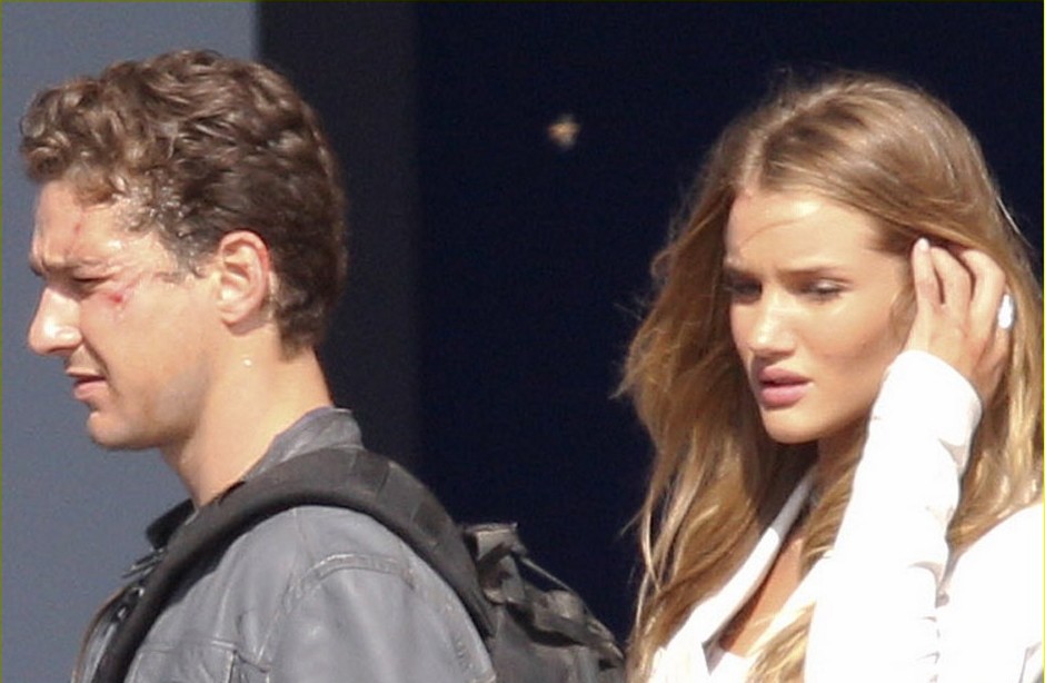 June 17th 2010 Los Angeles, California. ***WORLD EXCLUSIVE*** The very first photos of Shia LaBeouf and Rosie Huntington-Whiteley filming Transformers 3. Director Michael Bay and actor Tyreese also photographed. This thrilling action scene involves Shia and Rosie being chased by an evil Decepticon Transformer and the US military trying to fend off the evil robot. As Shia and Rosie run for safety through an office building, the Decepticon tips the building over. For this scene one floor of an office building was built on a giant platform that tilts to an angle. All cast and crew appeared to be very happy working together and very focused on creating the “greatest action film of all time”. Later in the day, while filming continued, a big satellite TV was brought on the set to air the live championship game between the Los Angeles Lakers and the Boston Celtics. Everyone stopped working to watch the final few minutes of the exciting game. When the Lakers won, there were wild cheers and applause by most people on set including big Laker fan, Shia LaBeouf. Photo by Eric Ford/ On Location News. 818-613-3955 info@onlocationnews.com