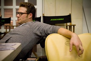 Set Rogen leans back in a chair at the edge of the set, “The Green Hornet” December 1, 2009