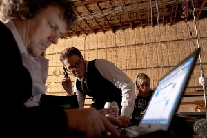 Director Michel Gondry, Seth Rogen and script supervisor Anne Rapp work separately yet together during a break, “The Green Hornet” November 20, 2009