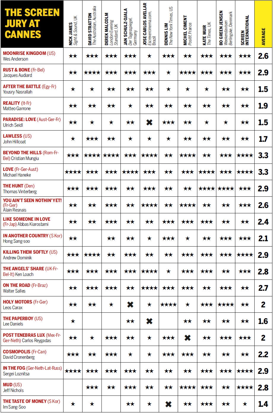 Grazie al daily di Screen International pubblichiamo la classifica finale dei film del concorso di Cannes 2012, secondo i principali critici internazionali.