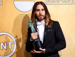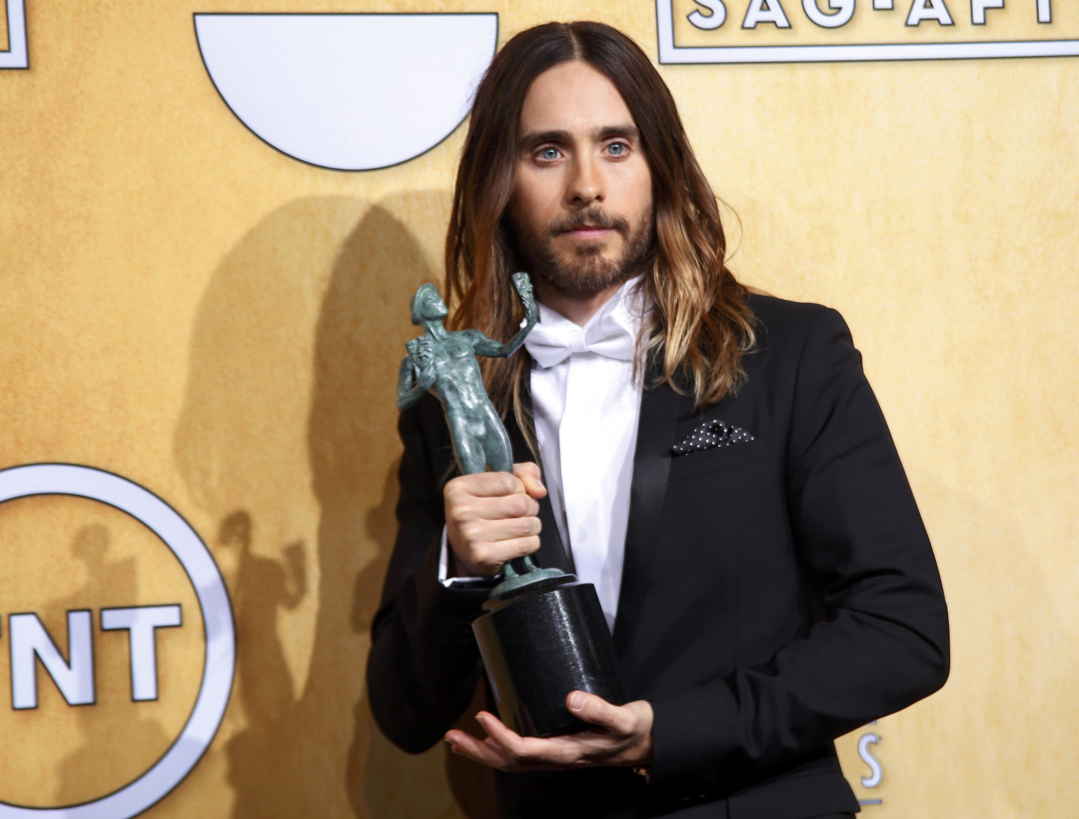 Actor Jared Leto poses backstage with his award for oustanding performance for a male actor in a supporting role in “Dallas Buyers Club” at the 20th annual Screen Actors Guild Awards in Los Angeles, California January 18, 2014. REUTERS/Lucy Nicholson (UNITED STATES Tags: ENTERTAINMENT)(SAGAWARDS-BACKSTAGE)