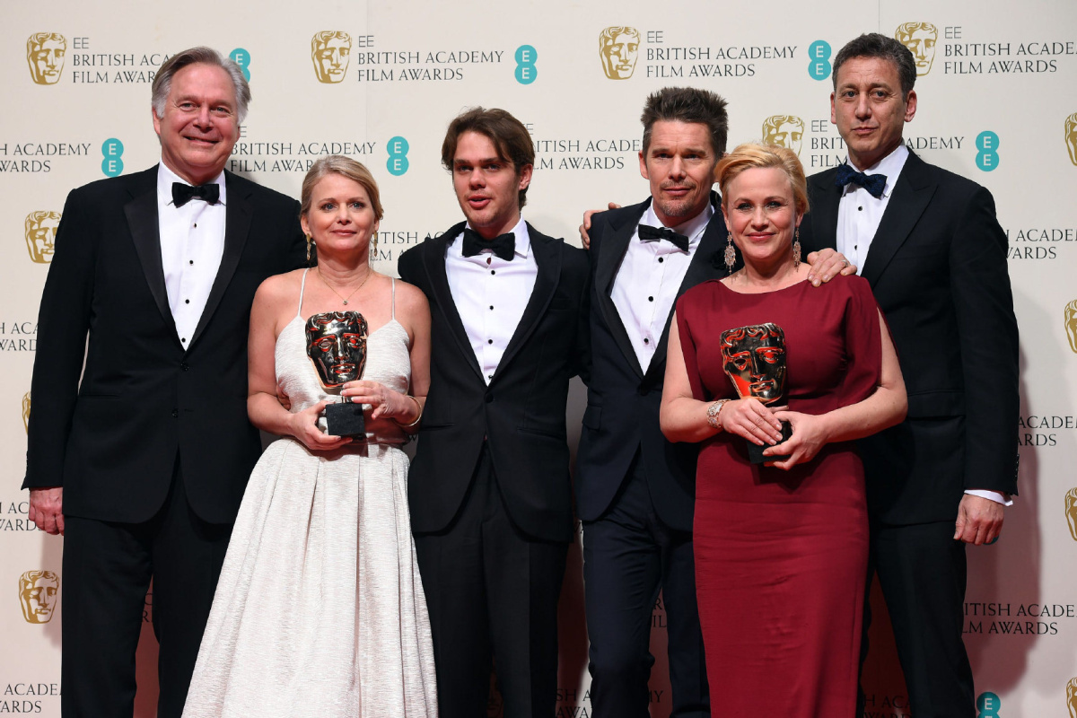 Cast and crew members from the winner of the Best Film Award, Boyhood, pose for photographers, in the winners room, during the British Academy Film and Television Awards 2015, at the Royal Opera House, in London, Sunday, Feb. 8, 2015. (Photo by Jonathan Short/Invision/AP)