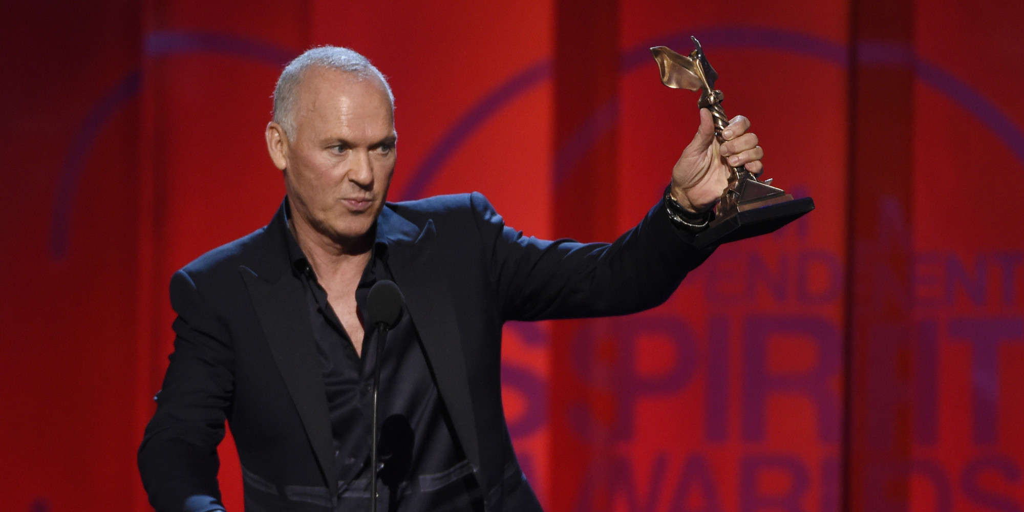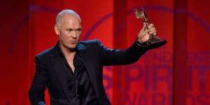 Michael Keaton accepts the award for best male lead for Birdman or (The Unexpected Virtue of Ignorance) at the 30th Film Independent Spirit Awards on Saturday, Feb. 21, 2015, in Santa Monica, Calif. (Photo by Chris Pizzello/Invision/AP)