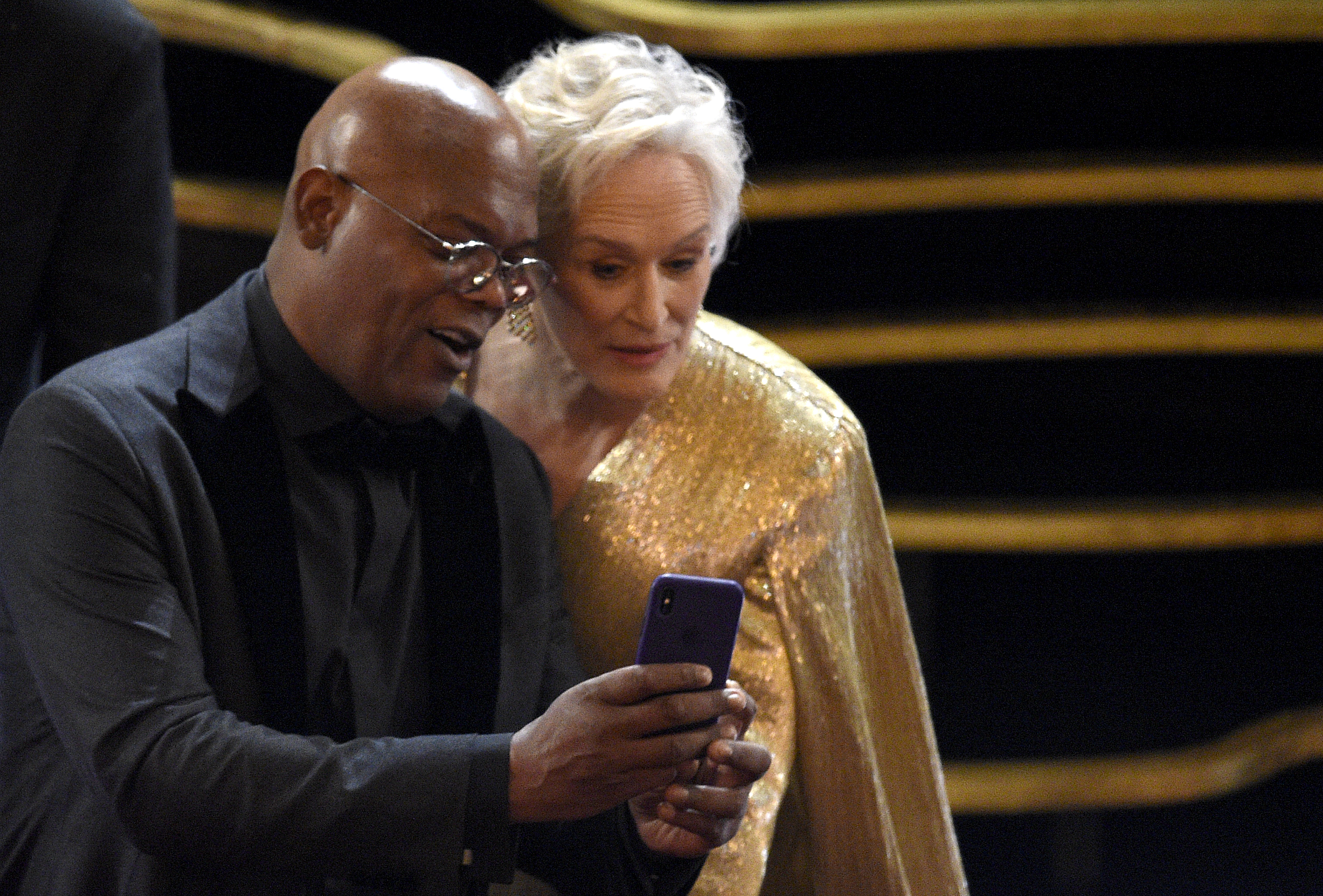 Samuel L. Jackson, left, and Glenn Close take a selfie prior to the start of the Oscars on Sunday, Feb. 24, 2019, at the Dolby Theatre in Los Angeles. (Photo by Chris Pizzello/Invision/AP)