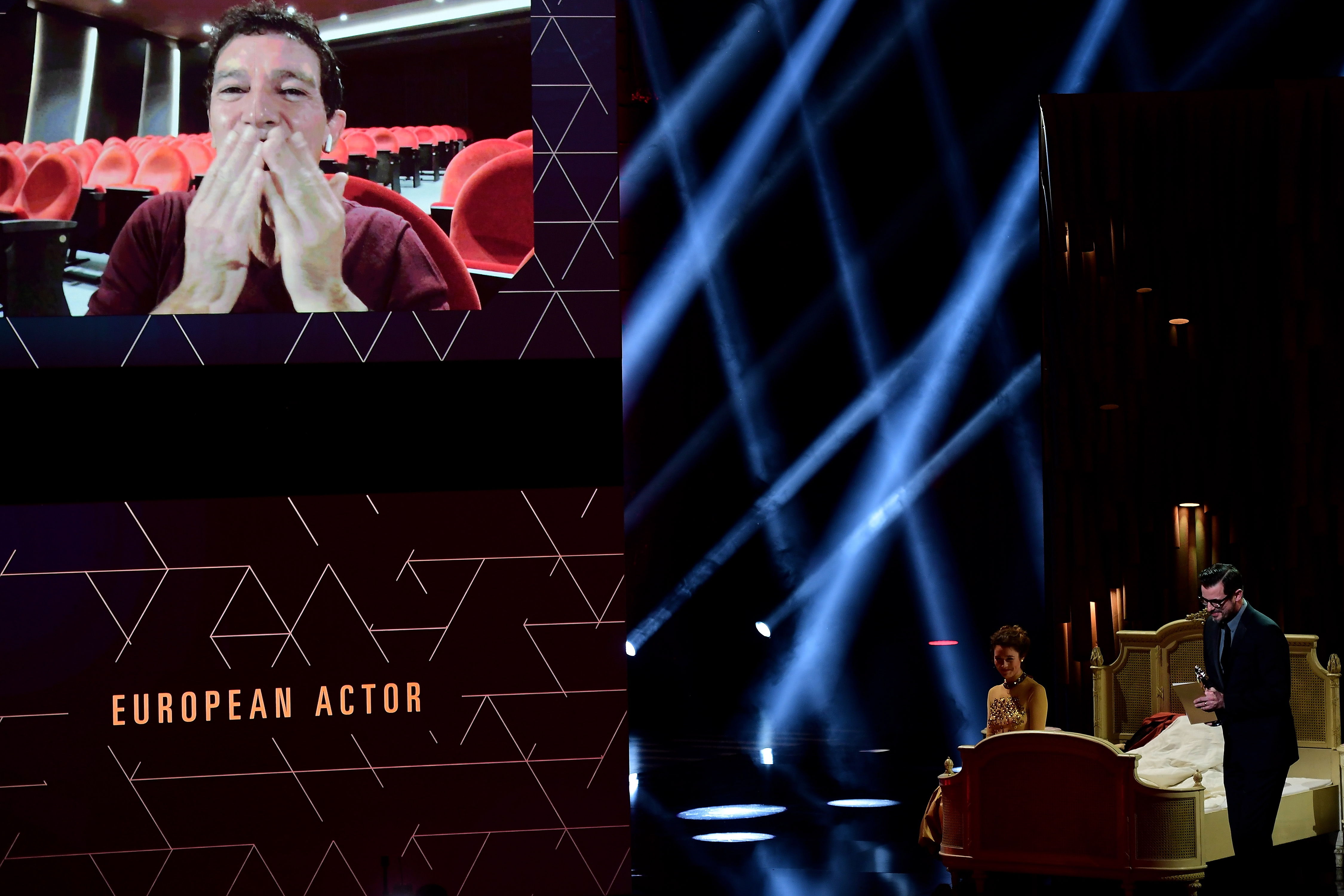 Berlin (Germany), 07/12/2019.- Spanish actor Antonio Banderas is seen on a big screen (L) as he thanks the participants after being awarded Best European Actor during the 32nd European Film Awards ceremony in Berlin, Germany, 07 December 2019. (Cine, Alemania) EFE/EPA/CLEMENS BILAN / POOL