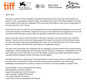 Sull’onda della cattiva abitudine di Cannes, anche Telluride, che avrebbe dovuto aprire il 3 settembre, si limiterà ad annunciare i film selezionati: “We hope you discover the titles we’ve selected for this year’s program at the New York Film Festival, Toronto International Film Festival, or Venice Film Festival, or when they’re made available on a wider basis. We will announce soon what we have carefully programmed in the hopes that you will experience as we did, the best in film this year.”