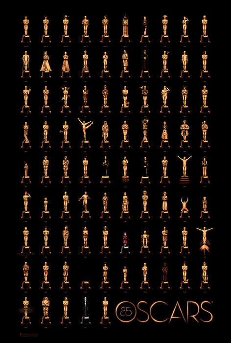 Giovanissimo artista inglese, autore di locandine minimaliste, Olly Moss è stato invitato dall'Academy ad interpretare a suo modo i primi 85 anni di Oscar, con un poster speciale con 85 statuette leggermente modificate... Eccole: